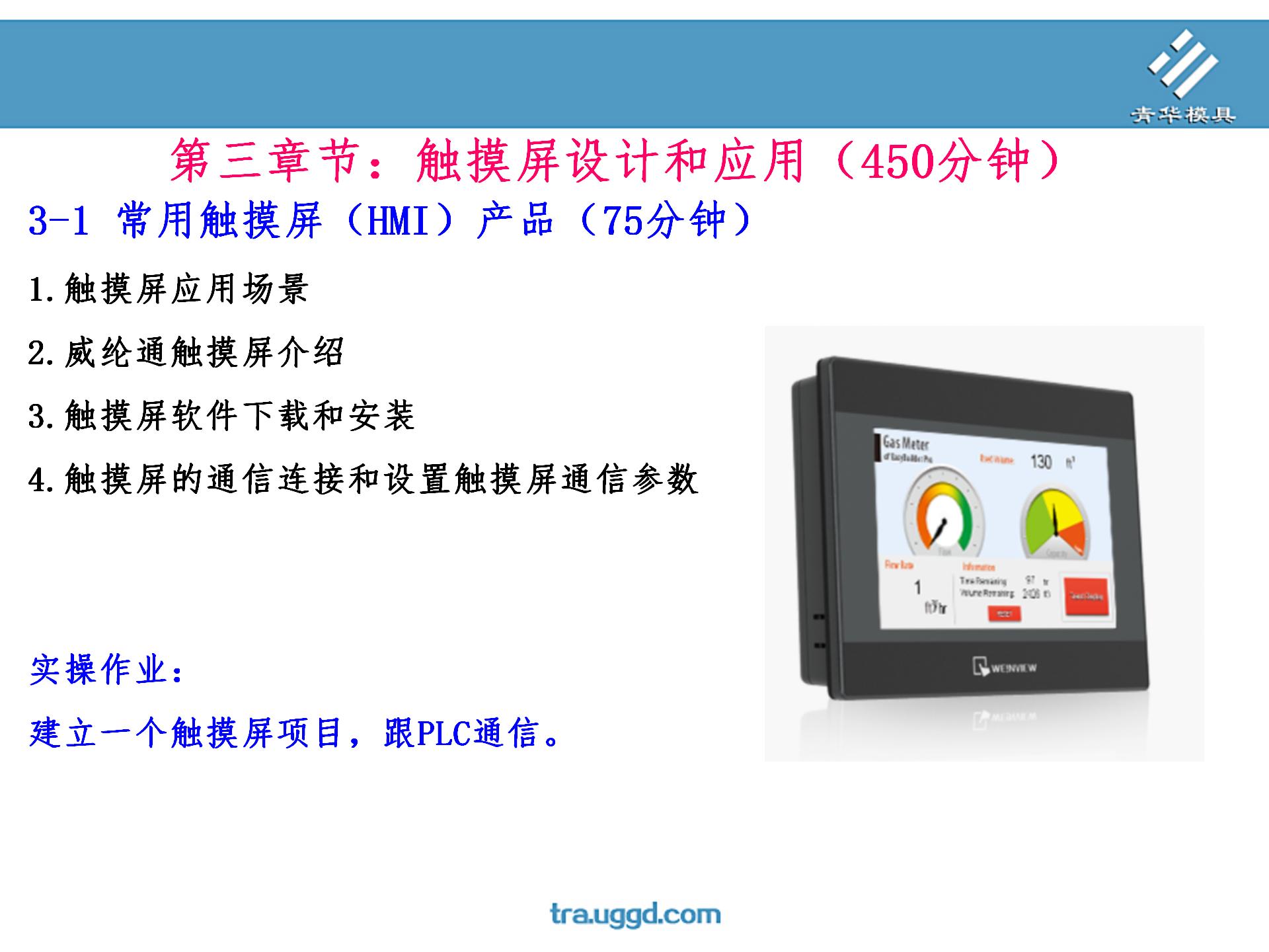 • 首页>课程大纲 >PLC编程>PLC编程第一阶段 >3-1 常用触摸屏(HMI)产品