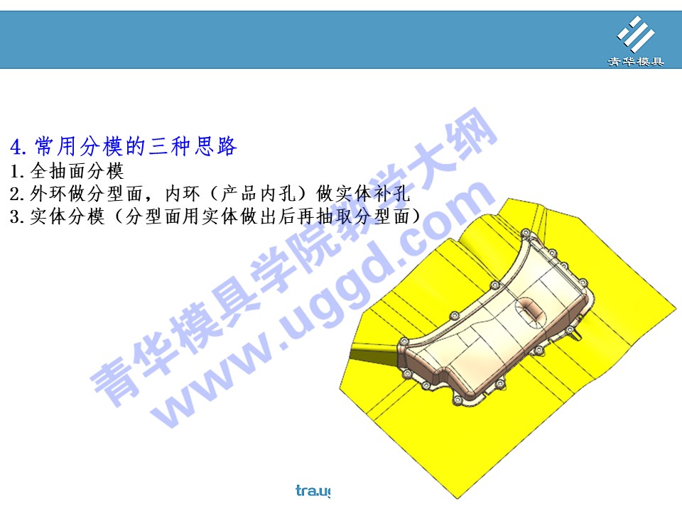• 首页>课程大纲 >塑胶模具设计>UG塑胶模具设计第一阶段 >4.常用分模的三种思路